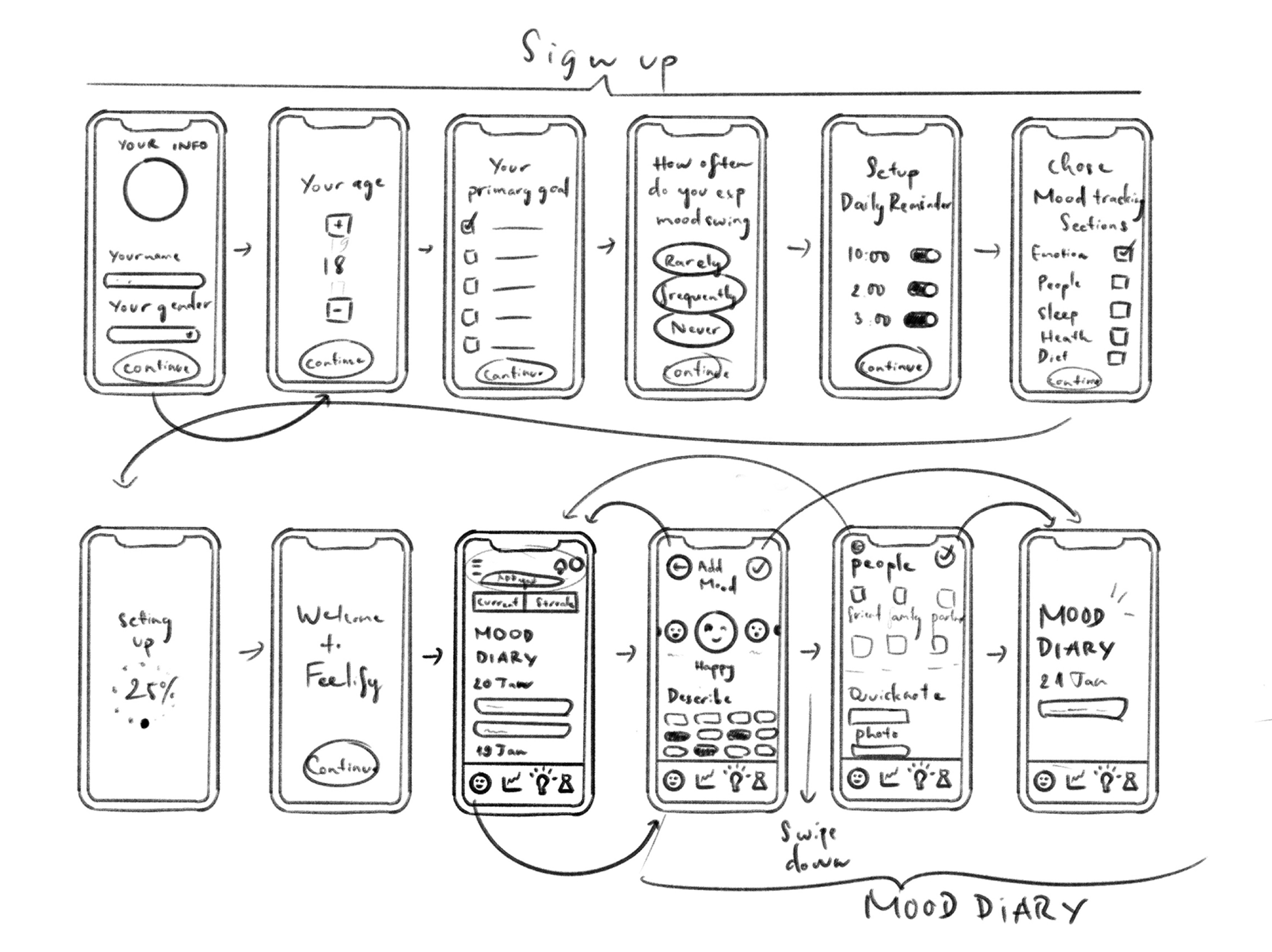 Feelify is designed to be quick and visual-first, so users can learn the flow in under 5 minutes. It gives them flexible ways to express their mood, like journaling or adding images, which improves analysis and recommendations. The flow below focuses on core tasks (sign-up, mood entry, progress review, in-app suggestions, and booking an expert appointment when needed) rather than detailed data outputs.