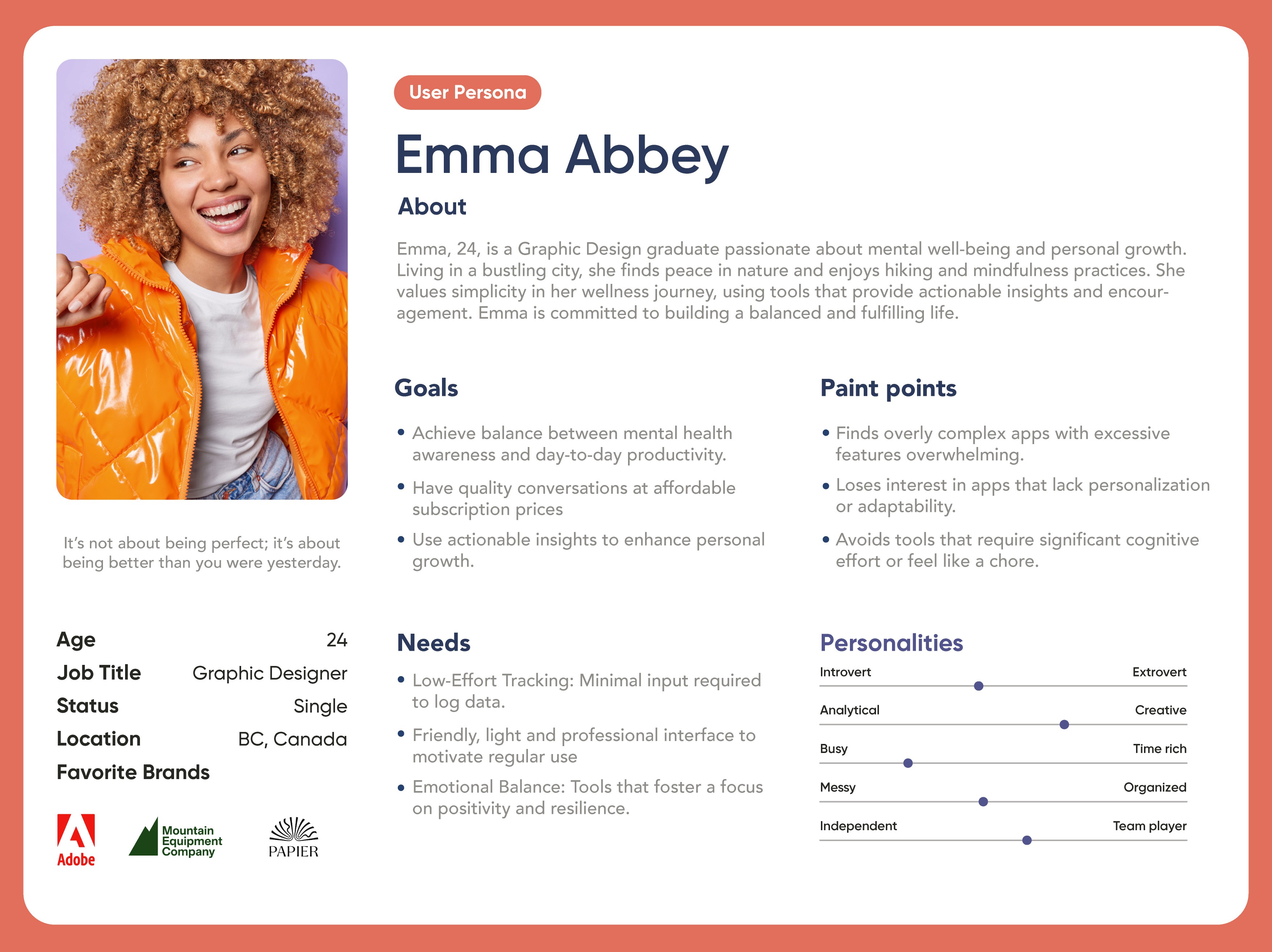 Represented by Emma (24), they prefer minimal and customizable check-ins and actionable insights that help them stay positive, build healthier habits, and support personal growth. Their biggest pain points are apps that feel too complex, time-consuming, or data-heavy , so privacy, personalization, and gentle motivation (like gamification) are key. When needed, they also value easy access to expert support for deeper guidance.