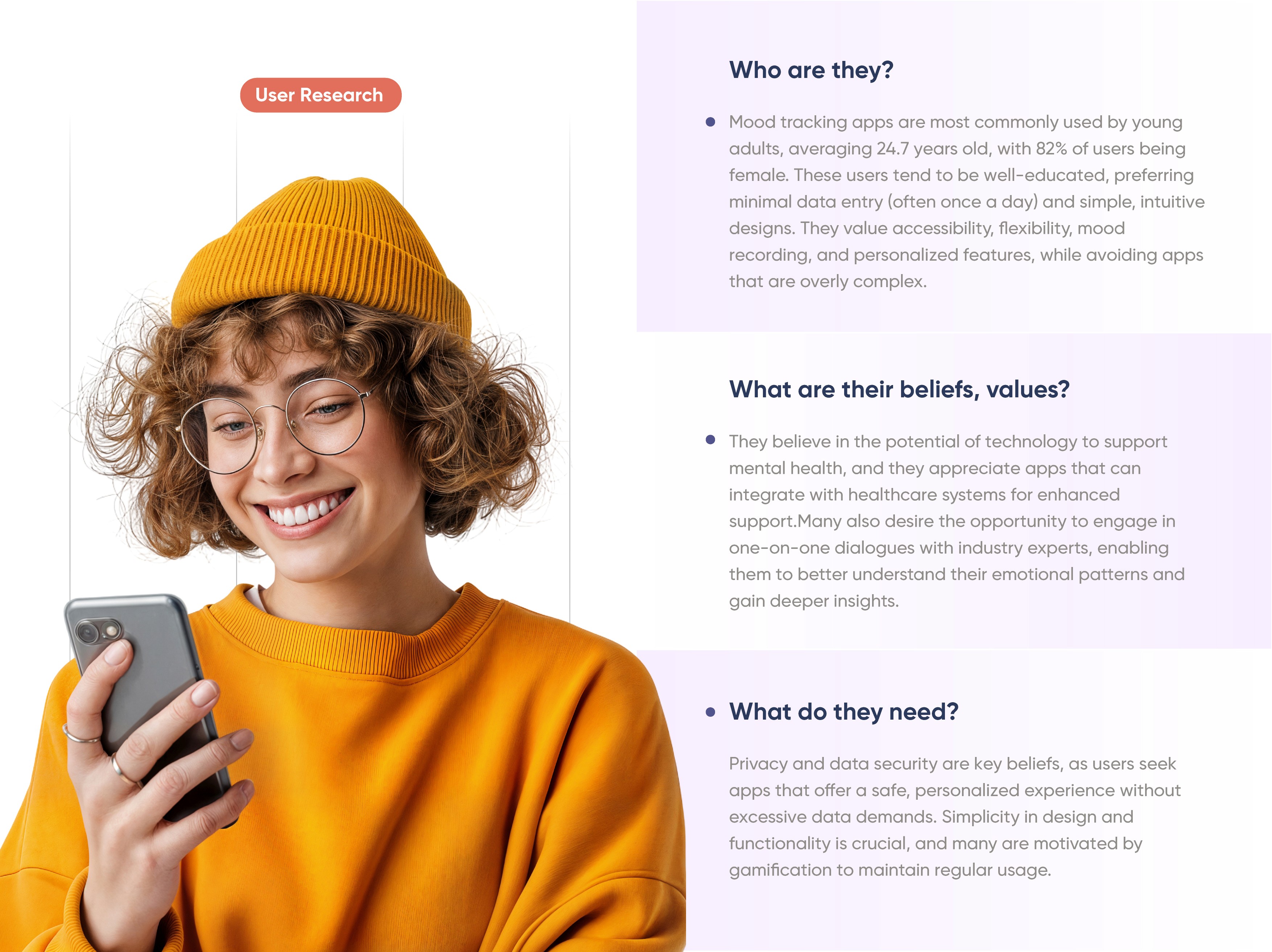 Our user research centers on young adults (mostly female) who want a simple and supportive way to track their moods without feeling overwhelmed.