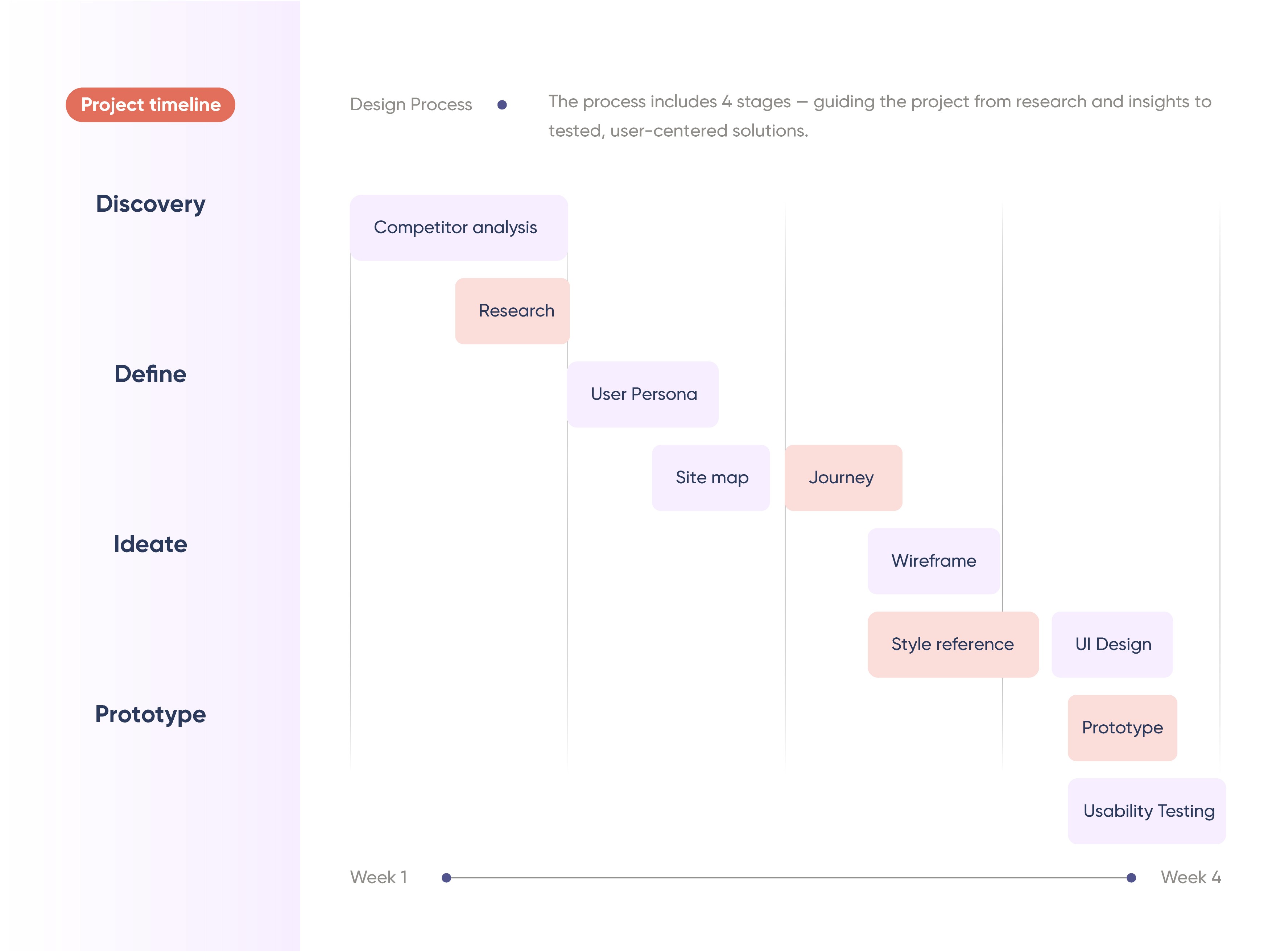 The project is condensed into four weeks to optimize team efficiency and encourage the use of AI in researching user preferences, the market, and competitors. The scope of work spans from foundational UI/UX analysis to art direction, wireframe sketching, defining the prototype system, and usability testing with potential users.